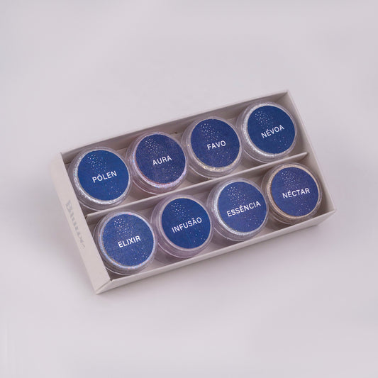 Kit GlitterBlu é o primeiro brilho personalizável do Brasil, que traz a possibilidade de criar misturinhas em mesa com a segurança da Bluwe e conta com 8 potes de brilho de 0,5 g cada.