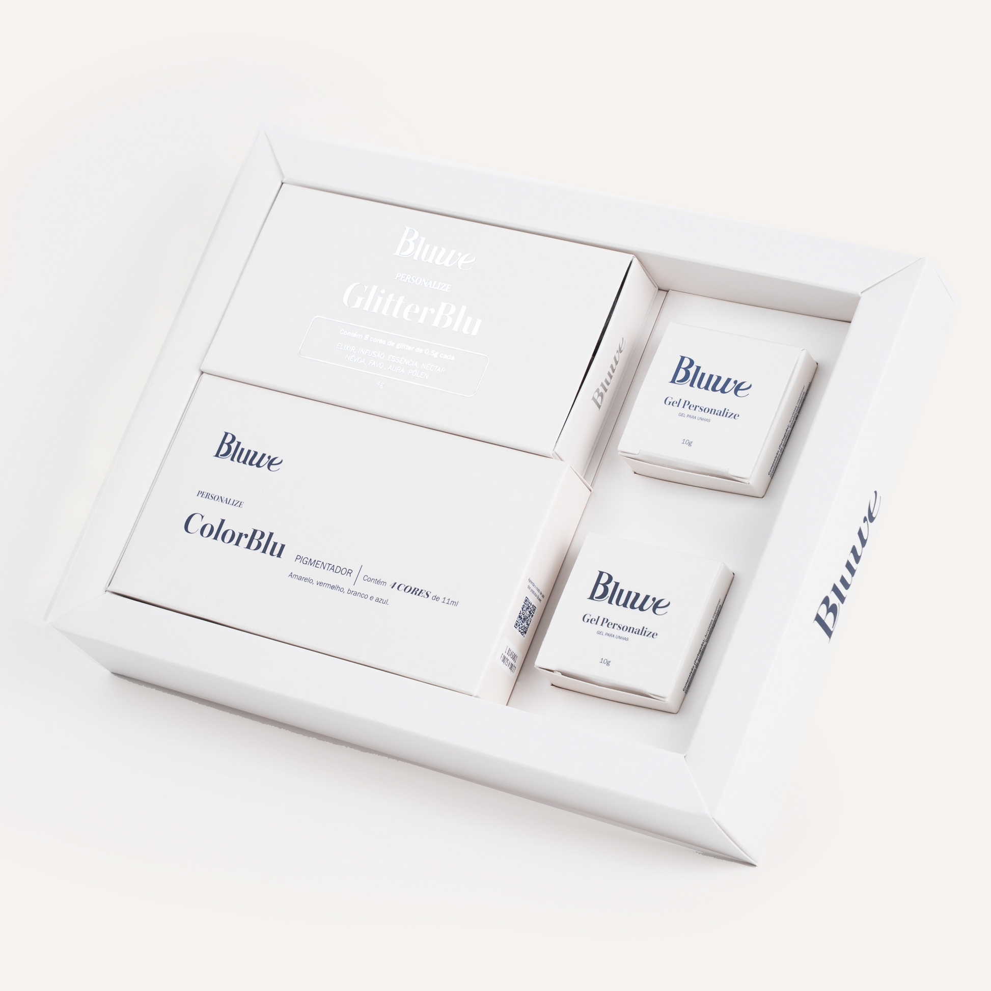 O Kit Personalize Bluwe é composto por 3 produtos da Linha Personalize: ColorBlu, Gel Personalize e GlitterBlu. Juntos, eles são um kit exclusivo e pioneiro para criar as misturinhas em mesa com segurança e compatibilidade entre o gel de unha, os pigmentos e os glitters. O Kit Personalize proporciona à nail designer maior liberdade criativa, autonomia e agrega valor ao trabalho da profissional aplicado em mesa, além de encantar as clientes com um produto feito e pensado para elas.